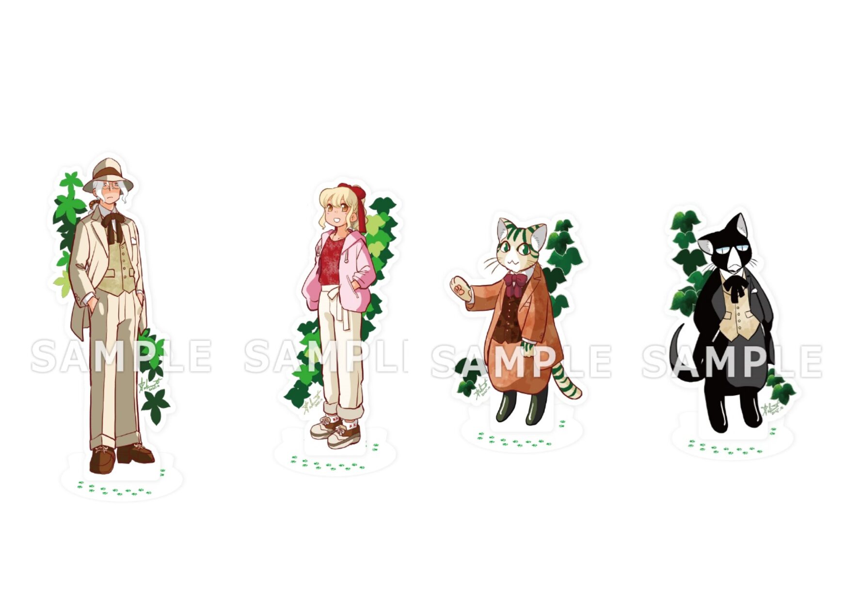 台座はねこの形をしていて、とてもかわいいデザインのアクスタです。ぜひ全員をお迎えください!