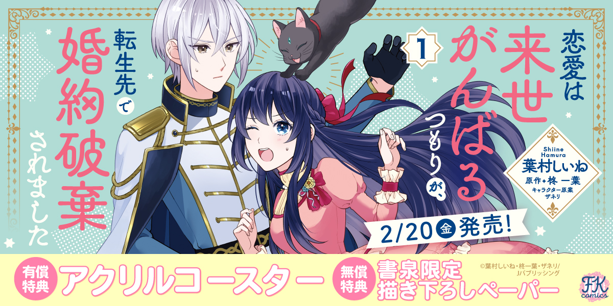 書泉ブックタワー7階, 書泉ブックタワー8階, 書泉グランデ2階, 書泉グランデ3階にて、FKcomics『恋愛は来世がんばるつもりが、転生先で婚約破棄されました1』発売記念フェアを開催いたします!